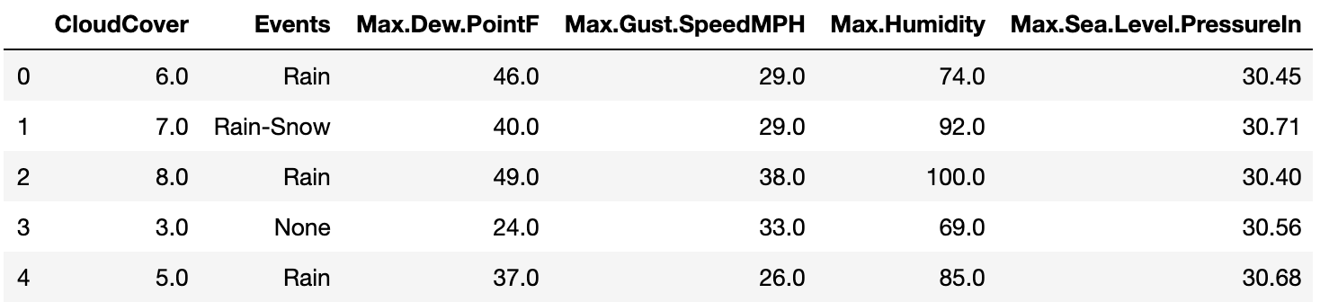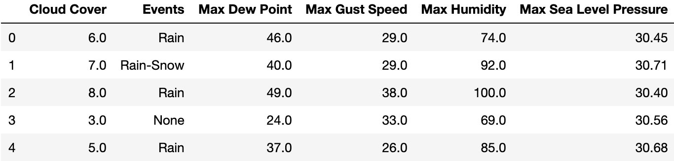 columns = ["Cloud Cover", "Events", "Max Dew Point", "Max Gust Speed", "Max Humidity", "Max Sea Level Pressure"]