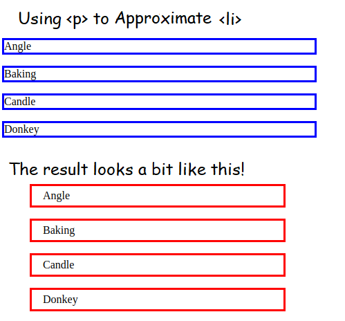 The upper half of this picture holds the default appearance of ul and li. The lower half of it shows the styling-instructions that are going to be used within the second picture.