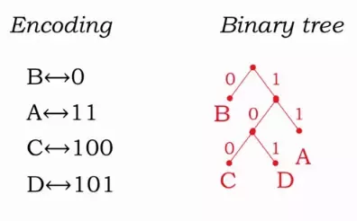 The above image shows how to encode with a binary tree. Every time we finish decoding a letter, we start at the root again.