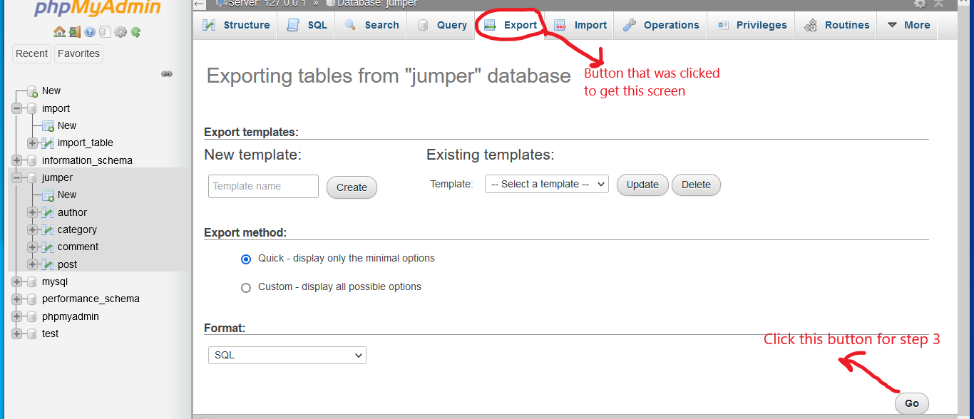 Leave everything as shown in the image above, or you can make changes you prefer. For example, you can choose a different export format to change yours from SQL (which we are going to be using) to any other.