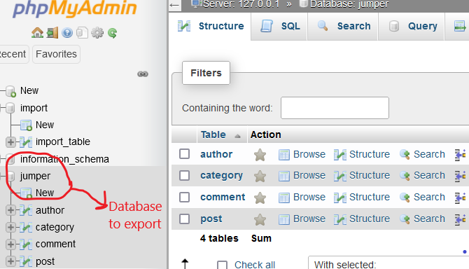This step may seem trivial, but you have to be sure you have phpMyAdmin up and running. You can install it either as stand-alone from the phpMyAdmin official site or shipped with XAMPP or WAMPP, based on how you set up your development environment.