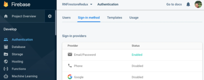 Now, in order to make it work, we need to open firebase console > Authentication > Sign-in Method and enable E-mail/Password, as shown below: