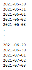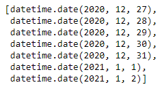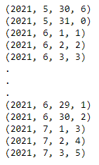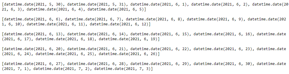 for date in my_calendar.monthdatescalendar(2021, 6):