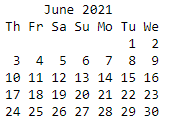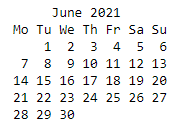 Using our pre-set examples of 2021 for the year argument and 6 (June) for the month argument, if the firstweekday argument is set to default (0), our calendar will look like this: