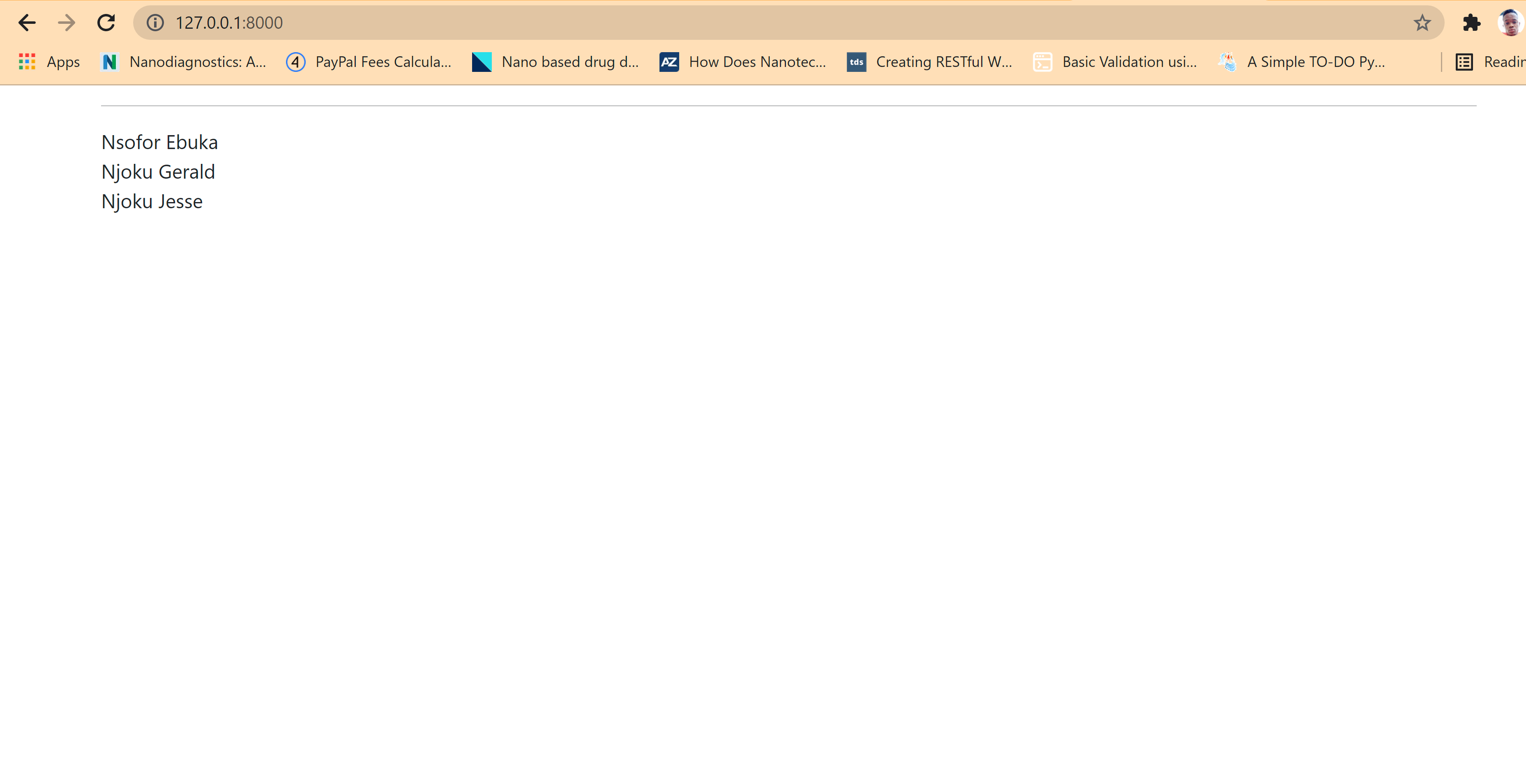 <!DOCTYPE html><html lang="en"><head><meta charset="UTF-8"><meta name="viewport" content="width=device-width, initial-scale=1.0"><title>Crud</title><!-- bootstrap --><link href="https://cdn.jsdelivr.net/npm/bootstrap@5.0.0-beta1/dist/css/bootstrap.min.css" rel="stylesheet" integrity="sha384-giJF6kkoqNQ00vy+HMDP7azOuL0xtbfIcaT9wjKHr8RbDVddVHyTfAAsrekwKmP1" crossorigin="anonymous"></head><body><div class="container mt-3"><hr><!-- the block is used to loop the dataset -->{% for data in queryset %}<!-- setting using cycle in the template --><div class="{% cycle 'row1' 'row2' %}"><!-- double curly braces use to display data -->{{data.name}}{{data.age}}{{data.level}}</div><!-- end of the forloop -->{% endfor %}</div></body></html>