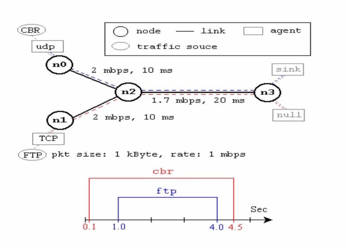 A “TCP” agent is attached to n1, and a connection is established to a TCP “sink” agent attached to n3. A TCP “sink” agent generates and sends ACK packets to the sender (TCP agent) and frees the received packets. A “UDP” agent that is attached to n0 is connected to a “null” agent attached to n3. A “null” agent frees the packets received.