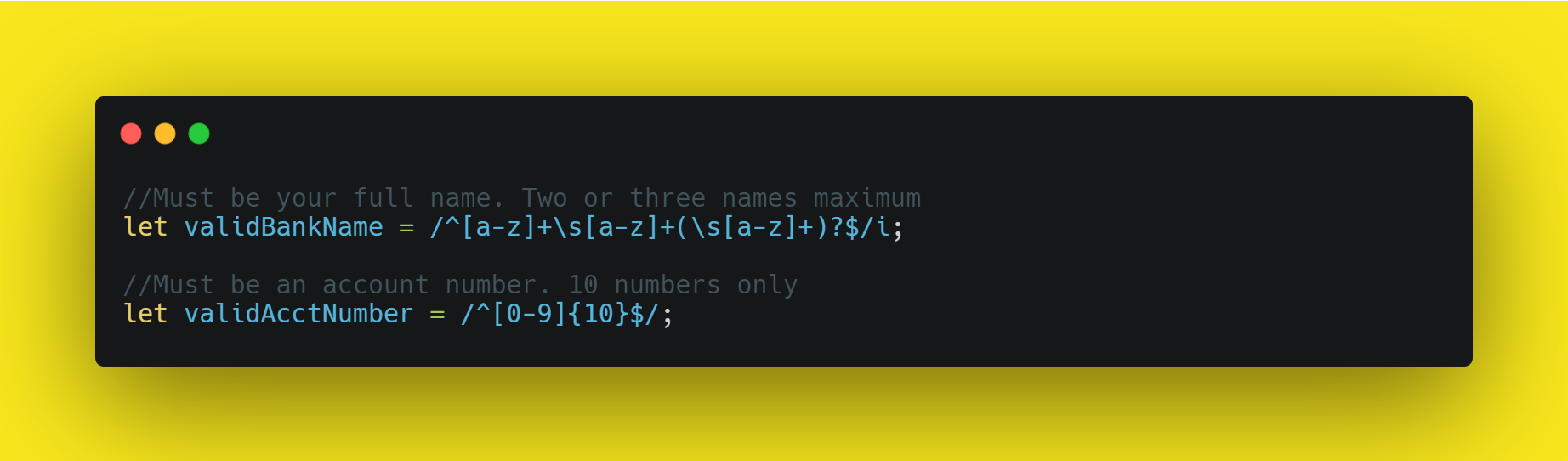 After all the codes are inside the higher-order function, we then create our regex values that will be passed as the valid expression for a user account name and account number.