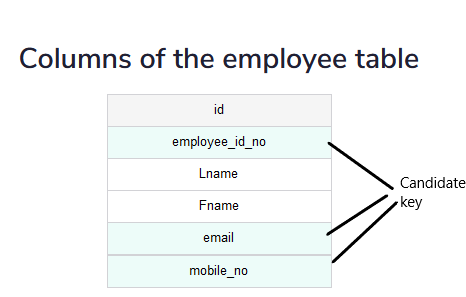 employee_id_no,emailandmobile_nocan serve as candidates to be used as primary keys. So, a candidate key is a unique identifier that has the potential to serve as a primary key.