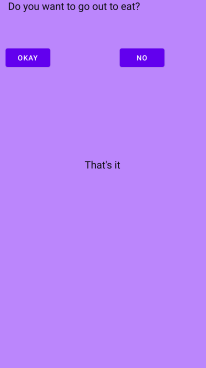 <?xml version="1.0" encoding="utf-8"?><RelativeLayout xmlns:android="http://schemas.android.com/apk/res/android"android:layout_width="match_parent"android:layout_height="match_parent"android:paddingLeft="15dp"android:paddingRight="15dp"android:background="@color/purple_200"><TextViewandroid:id="@+id/textview1"android:layout_width="352dp"android:layout_height="50dp"android:text=" Do you want to go out to eat? "android:textColor="#070707"android:textSize="20sp" /><Buttonandroid:id="@+id/button1"android:layout_width="wrap_content"android:layout_height="wrap_content"android:layout_alignBottom="@id/textview1"android:layout_marginBottom="-90dp"android:text="Okay" /><Buttonandroid:id="@+id/b2"android:layout_width="wrap_content"android:layout_height="wrap_content"android:layout_alignRight="@id/button1"android:layout_alignBottom="@id/textview1"android:layout_marginRight="-225dp"android:layout_marginBottom="-90dp"android:text="No" /><TextViewandroid:id="@+id/text2"android:layout_width="wrap_content"android:layout_height="wrap_content"android:layout_alignBottom="@+id/button1"android:layout_centerInParent="true"android:textColor="#070707"android:textSize="20dp"android:layout_marginBottom="-200dp"android:text="That's it" /></RelativeLayout>
