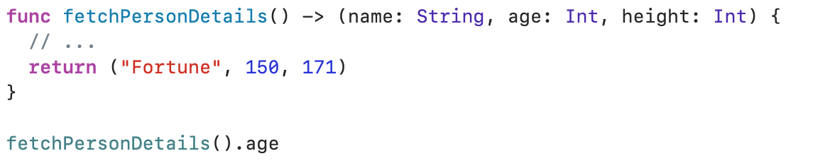 func split(name: String) -> (firstName: String, lastName: String) {let split = name.components(separatedBy: " ")return (split[0], split[1])}let parts = split(name: "Mahemmido Behira")print(parts.0) //This prints "Mahemmido"print(parts.1)//This prints "Behira"print(parts.firstName) //This prints "Mahemmido"print(parts.lastName) //This prints "Behira"