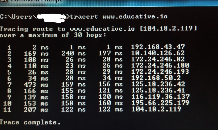 Let’s create a traceroute to educative.io. We do this by entering the following command in our terminal or command prompt: