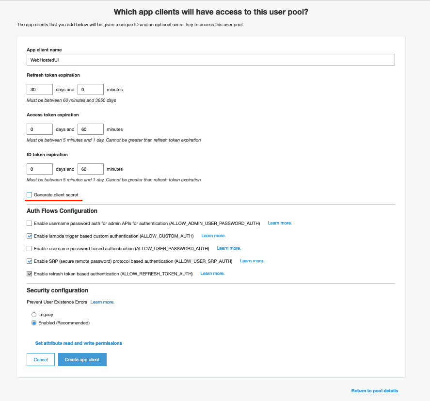 You should provide the name of the client and de-select the Generate client secret option. This option can be used when you have a server-side component to generate the client secret. Once the app client is created, we will move to Step 4.