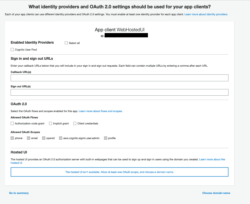 To get the Web Hosted UI, you have to use this configuration. If you have your own domain, provide your custom domain; else, use the AWS domain.