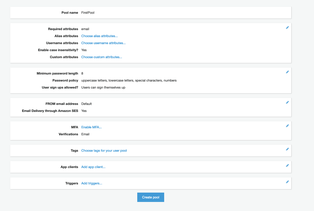 - Step 5: Press the Create Pool button and your User Pool will be created.