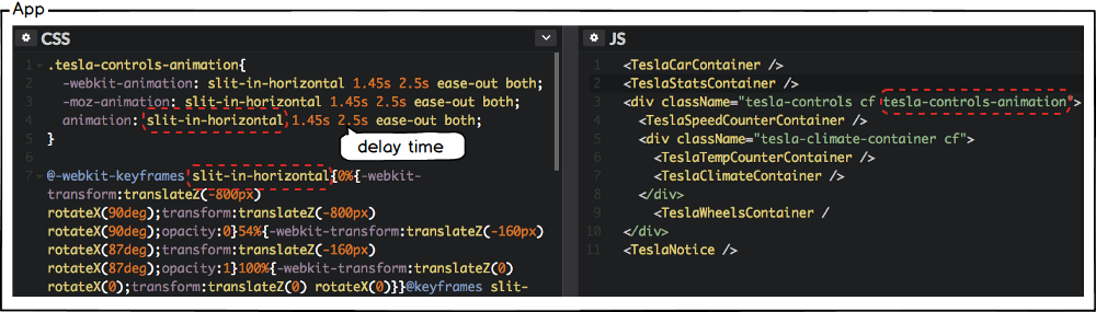 This time, let’s give the TeslaStats component a slit-in-horizontal animation effect. Give the delay 2 seconds to start after the TeslaCar animation runs.
