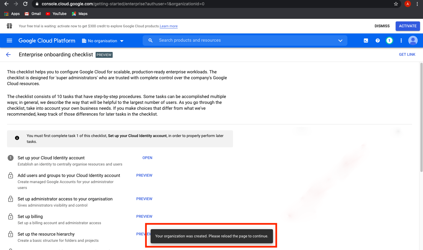 Each GCP account can have only one organization node, and the organization is automatically created when you sign in using a custom domain name email that does not end in “@gmail.com”. For example, in the below image, the organization named dockertutorials.in is created automatically.