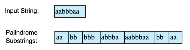 Given a string find all non-single letter substrings that are palindromes. For instance: